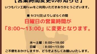 いつもパン工房Franにご来店いただきありがとうございます。日曜日の営業時間短縮に伴い、今まで定休日だった火曜日を通常営業することになりました。これからもパン工房Franをよろしくお願いいたしますみなさまのご来店を心よりお待ちしております🐱...