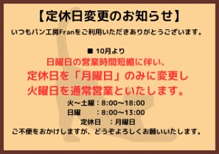 【定休日変更のお知らせ】 お知らせ 2025.09.25 いつもパン工房Franにご来店いただきありがとうございます。日曜日の営業時間短縮に伴い、今まで定休日だった火曜日を通常営業することになりました。 これからもパン工房Franをよろしくお願いいたします みなさまのご来店を心よりお待ちしております🐱♪季節限定パンや新作もご用意しておりますので、お楽しみに! 火曜〜土曜:8:00〜18:00日曜:8:00〜13:00定休日:日曜午後、月曜日
