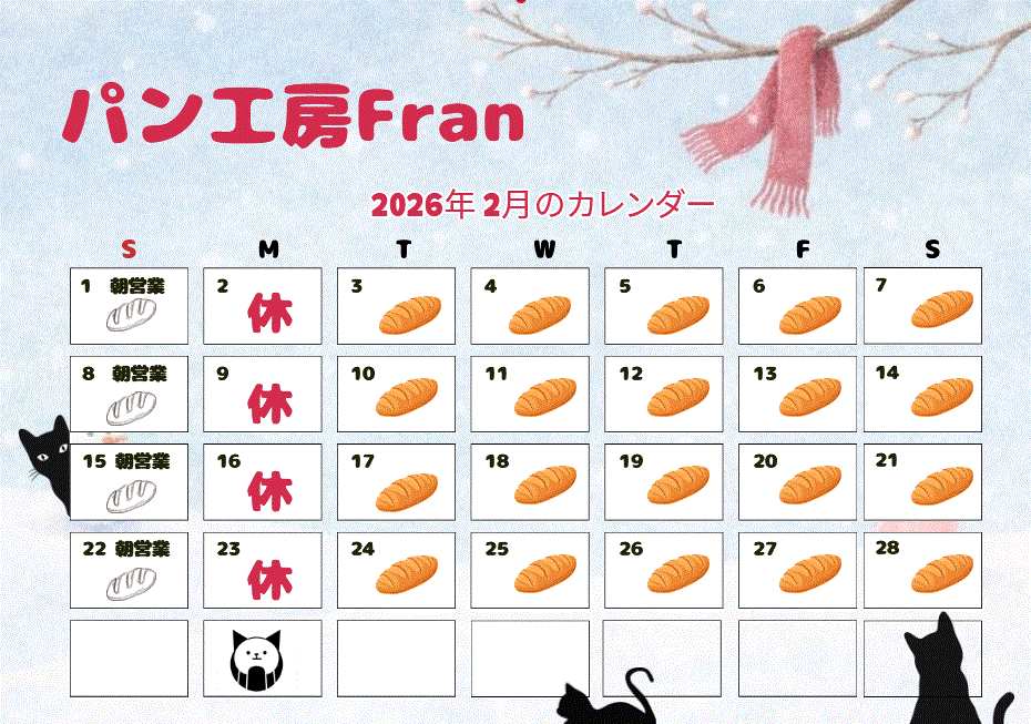 おこしの際には、下のカレンダーをご確認のうえ、ぜひお気に入りのパンを見つけに来てくださいね。