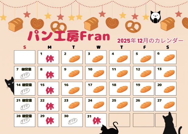 おこしの際には、下のカレンダーをご確認のうえ、ぜひお気に入りのパンを見つけに来てくださいね。